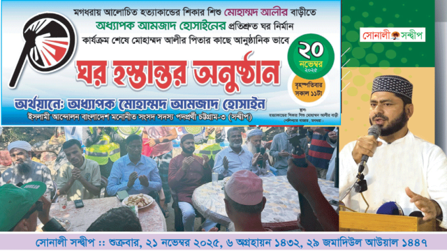 সম্প্রতি চট্টগ্রাম জেলার সন্দ্বীপ উপজেলার মগধরা ইউনিয়নে সংগঠিত হত্যাকান্ডে মোহাম্মদ আলী নামের এক শিশু নিয়ত হওয়ায় মানবিক সহায়তার অংশ হিসেবে আসন্ন ত্রয়োদশ জাতীয় সংসদ নির্বাচনে ইসলামী আন্দোলন বাংলাদেশ মনোনীত চট্টগ্রাম-৩ (সন্দ্বীপ) আসনের প্রার্থী অধ্যাপক আমজাদ হোসেন তার পরিবারকএকটি ঘর নির্মান করে দেন। যা গত ২০ নভেম্বর২৫ আনুষ্ঠানিকভাবে হস্তান্তর করা হয়েছে।