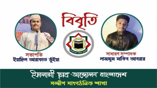 ইসলামী ছাত্র আন্দোলন বাংলাদেশ, সন্দ্বীপ উপজেলা শাখার সভাপতি ইয়াছিন আরাফাত ভূঁইয়া ও সাধারণ সম্পাদক নাজমুস সাকিব আবরার আজ এক যৌথ বিবৃতিতে বলেন—